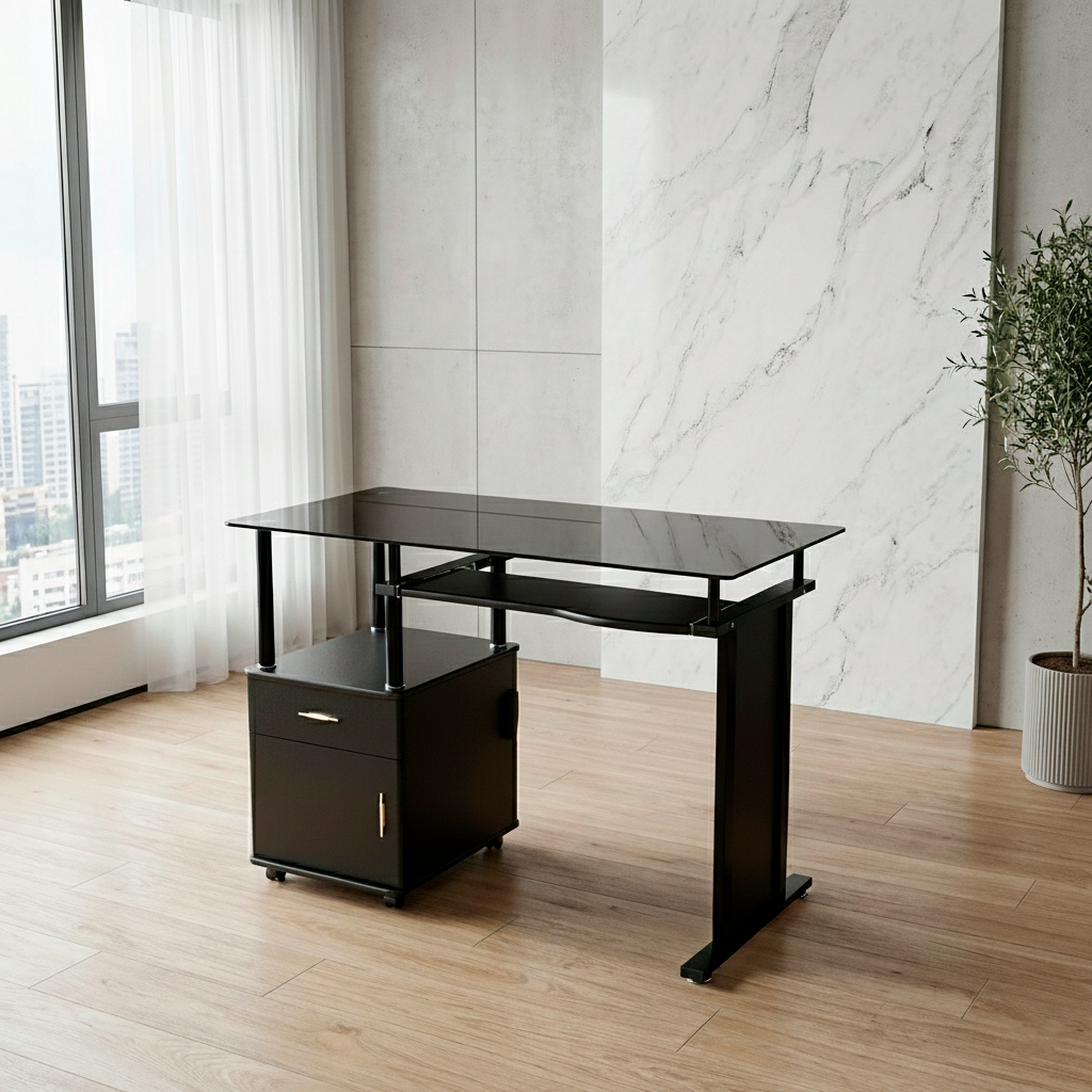 El Escritorio de Vidrio y Gaveteros RX 7321 es la combinación ideal entre diseño moderno, materiales duraderos y funcionalidad inteligente. Su superficie en vidrio ofrece una estética limpia y profesional, mientras que los gaveteros facilitan el orden diario en tu espacio de trabajo.